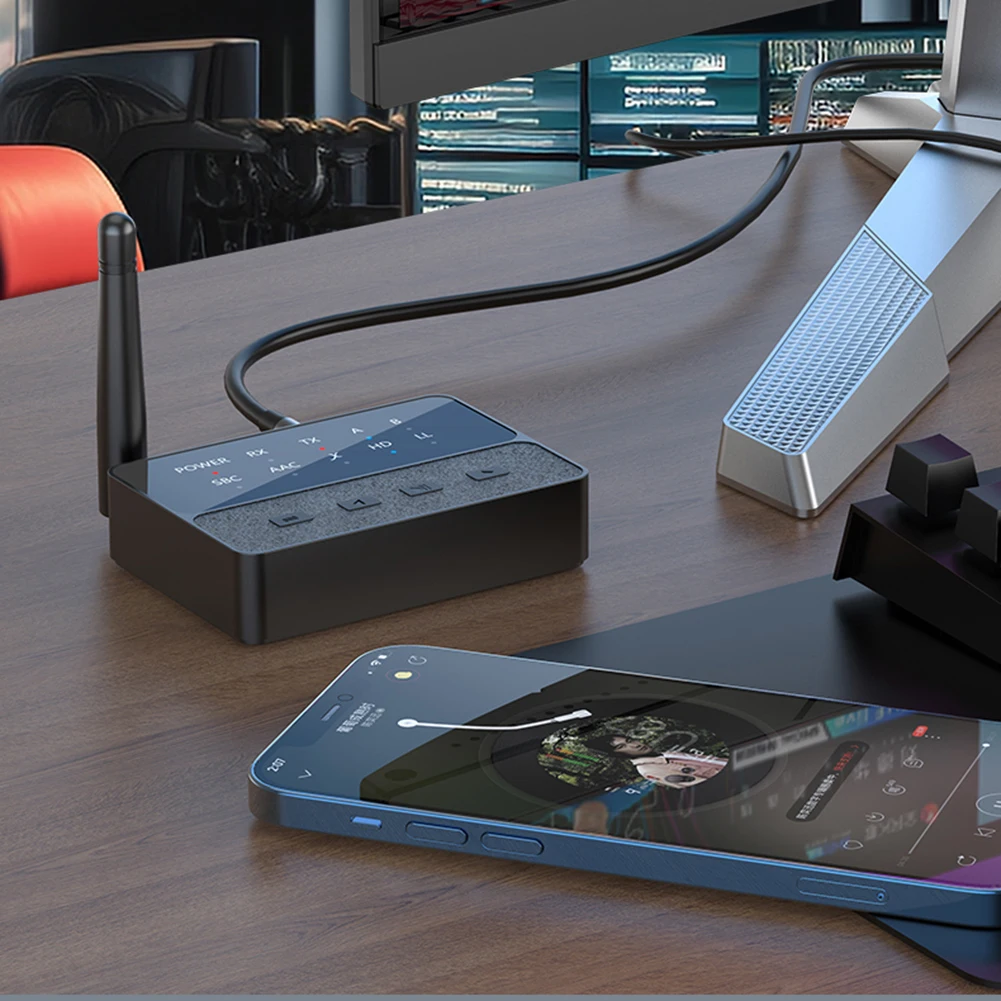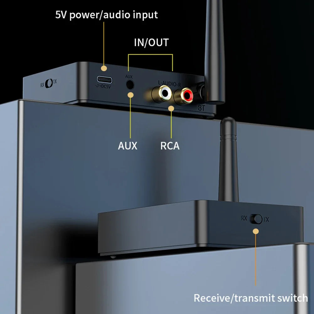 | Bluetooth-Compatible 5.3 APTX/HD/LL Audio Adapter 3.5mm AUX/RCA 2 In 1 Wireless Stereo Receiver Transmitter Wireless Audio Dongle for TV Car Speaker Feature: 1. Versatile 2-in-1 Functionality: The audio adapter seamlessly combines both receiver and transmitter capabilities, offering a wide range of interfaces to meet the diverse audio needs of various devices. Whether you're transmitting or receiving, this wireless stereo receiver transmitter ensures a versatile and immersive music experience for all your audio equipment. 2. High-Fidelity Sound Quality: Experience truly immersive sound with the hifi stereo adapter, which incorporates advanced technology in its carefully designed architecture to deliver professional-grade, lossless audio quality. Feel the charm of being in the midst of every tune, with every detail rendered perfectly. 3. Upgrade to Wireless Connectivity: Transform your old wired speakers or computer sound systems into modern wireless devices with the wireless audio dongle. By connecting via an AUX cable, you can easily upgrade to Bluetooth-Compatible 5.3 connectivity, making your devices compatible with wireless Bluetooth-Compatible connections from your phone, thus revitalizing your audio setup with minimal effort. 4. Effortless Wireless Experience for Desktops: Upgrade your desktop computer to a wireless haven with the stereo music adapter. It facilitates a hassle-free transition from wired to wireless connections, supporting aptX-LL for low latency and delivering high-definition, stable audio transmission. This ensures a crisp, uninterrupted listening experience for all your favorite tunes. 5. Enhanced Night-Time TV Watching: Connect the audio adapter directly to your TV or computer to instantly add Bluetooth-Compatible functionality, allowing you to wirelessly connect Bluetooth-Compatible headphones or speakers. With support for connecting two devices simultaneously and featuring a high-performance Bluetooth-Compatible 5.3 chip for stable, lag-free connections, it's perfect for night-time movie marathons, creating an atmospheric watching experience without disturbing others.