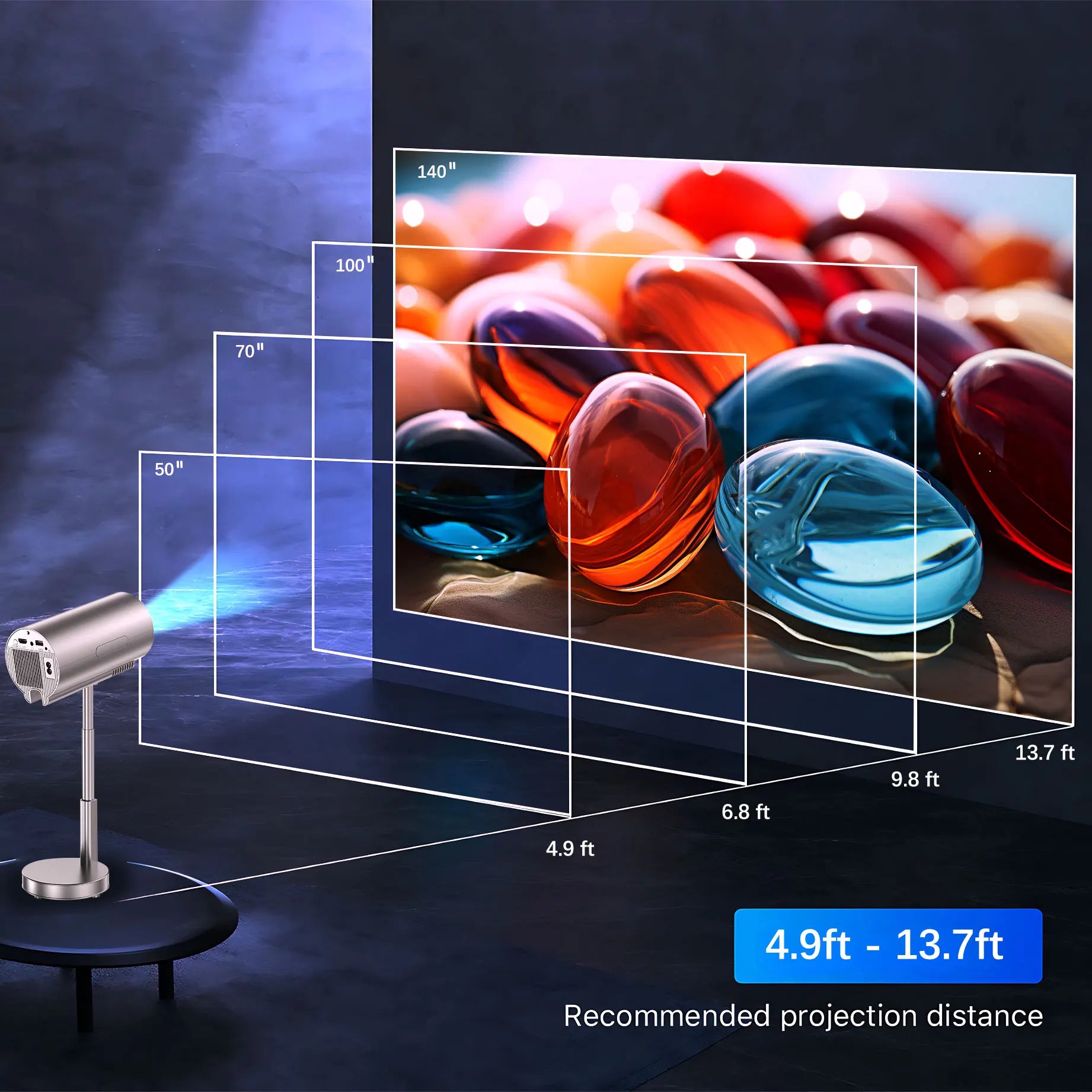- Easy setup and portability with foldable stand, auto/manual/electronic keystone correction, 49–140 inch image sizes, 4.9–13.7 ft throw, and a compact 1.5 kg body for travel.